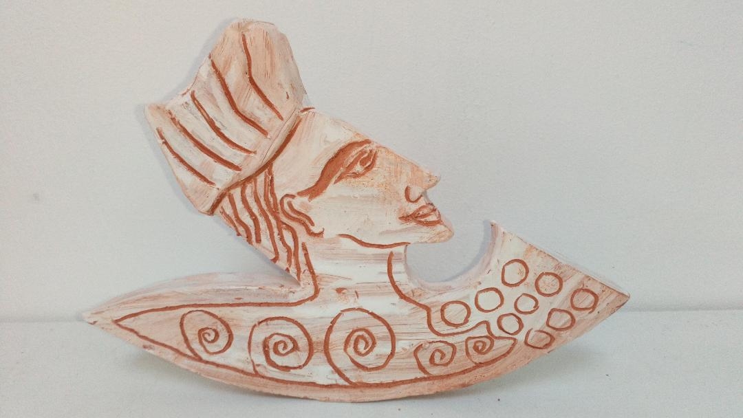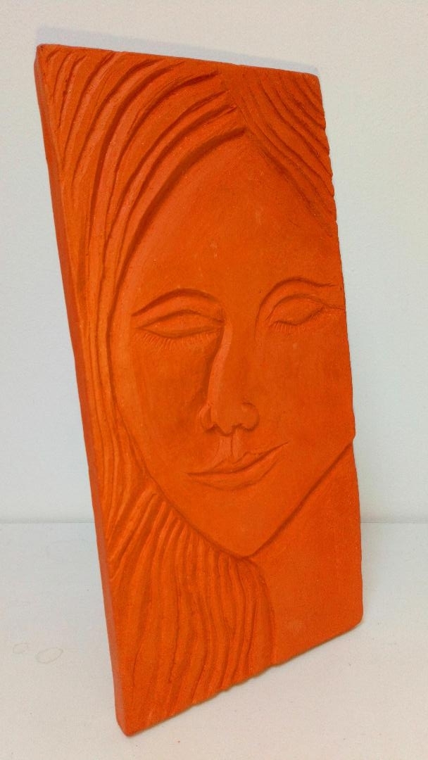 The Dreaming - red terracotta relief; 9cm wide, 18cm high, 8cm depth.