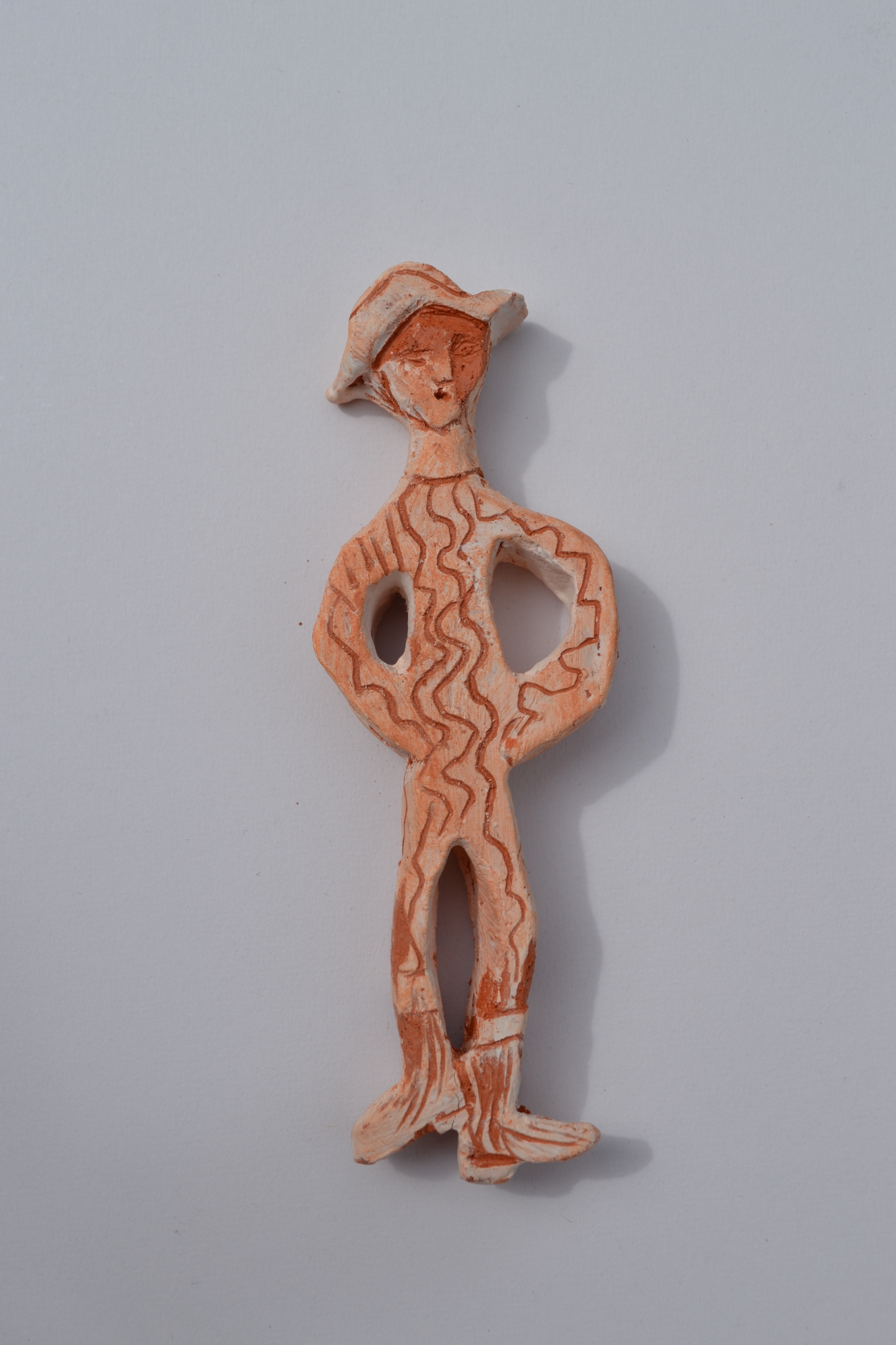 Small Figure Wth Hat - red terracotta with white slip; 10cm high.