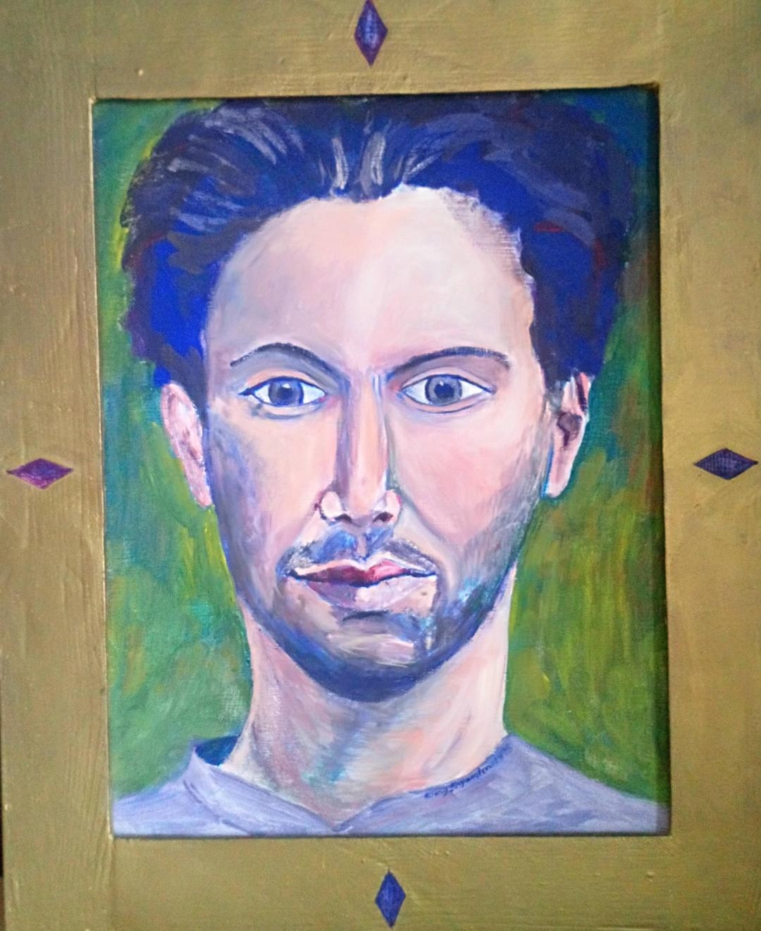 Philip with Blue and Gold. Egg Tempera on gessoed wood. 32 x 39.5 cms. Painted from life 1993