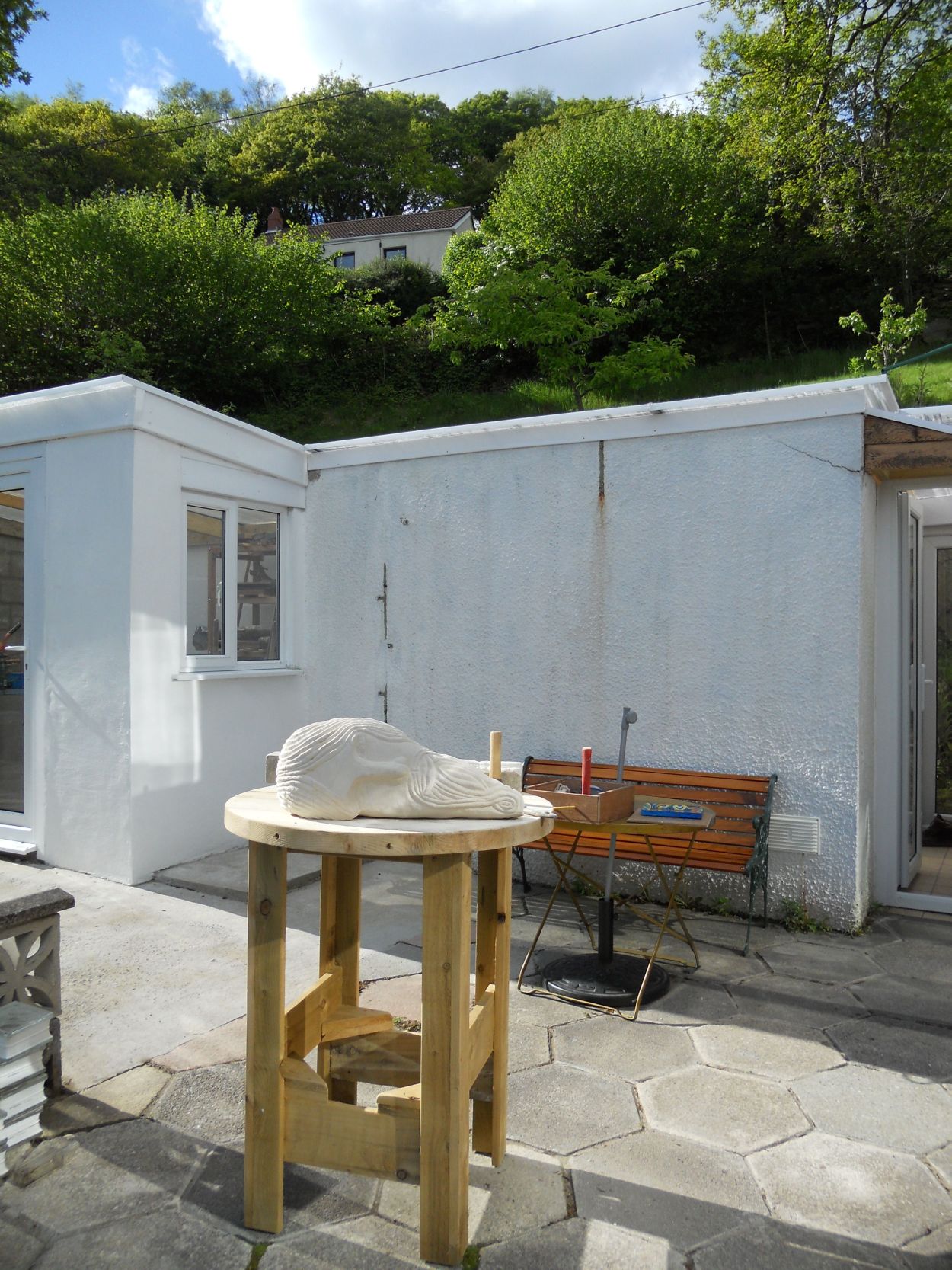 Various outbuildings have been converted into working spaces including a small stone carving studio, a conservatory for drawing & another larger workshop for the kiln, hand building in clay & also painting.